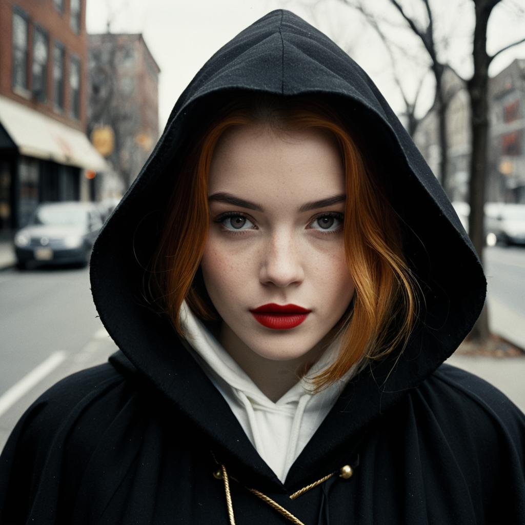 A mysterious young woman with golden freckles, red lipstick, and white eyes, wearing an all-black hooded cloak, posing for the camera. Ethereal portraiture in the style of Vivian Maier.