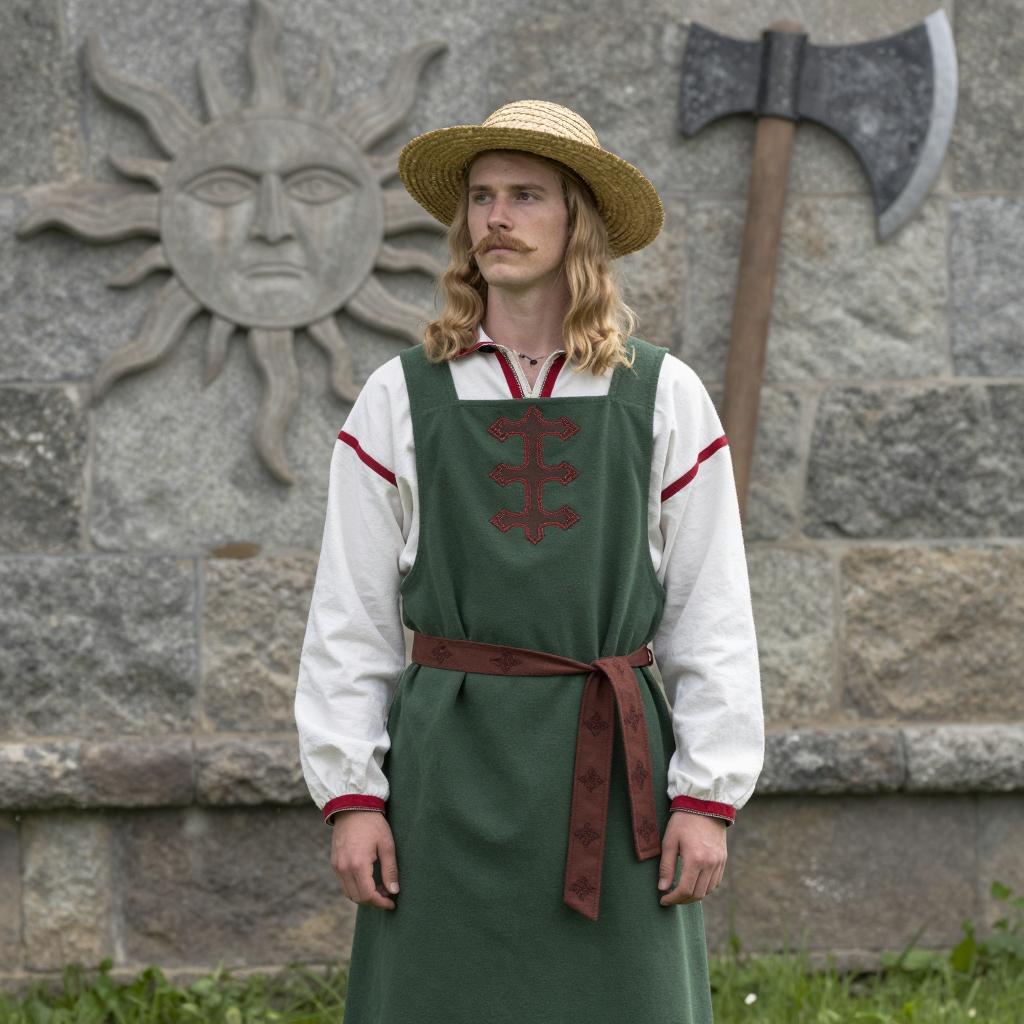 Midsommar costume, photograph of a young man, standing, medieval-style clothing, long blonde hair, mustache, straw hat, white shirt with red trim, green apron with red and brown patterns, stone wall background with carved sun and axe motifs, daytime, grass at bottom, realistic, detailed, natural light