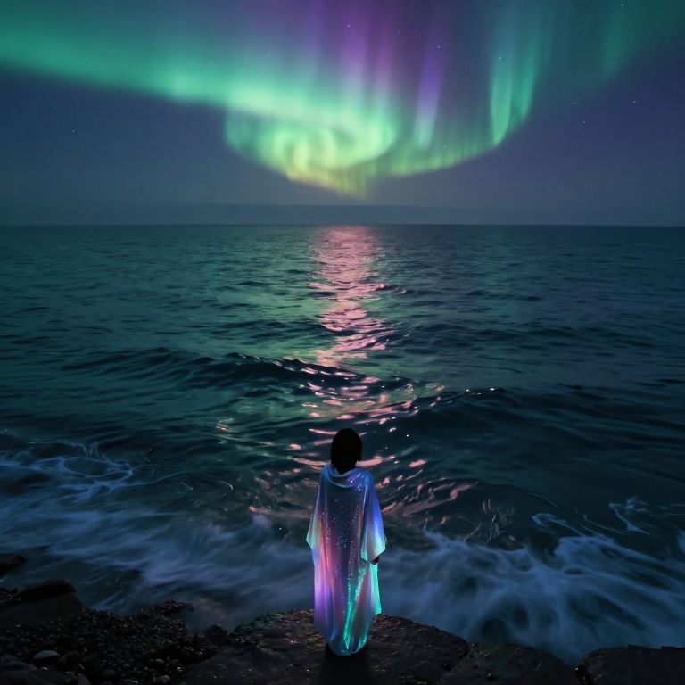A dreamlike seascape emerges in this digital art masterpiece, reminiscent of Idris Khan's ethereal landscapes. The scene portrays a moonlit ocean with water rippling and dancing as if alive, its undulating waves reflecting an array of colors from the overhead aurora borealis. A solitary figure clad in an iridescent cloak that sparkles like stardust stands at the water's edge, their form blending seamlessly with the surroundings from an elevated perspective behind them. The mood oscillates between tranquility and intrigue, enticing viewers to explore the mysteries concealed beneath the waves and beyond the horizon in this captivating blend of natural wonder and cosmic allure.