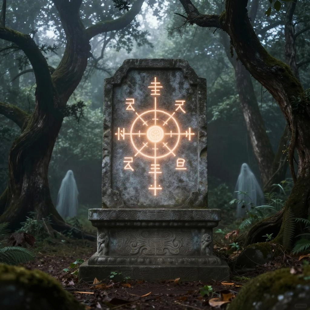 Mysterious oujia board resting on an ancient stone altar in a fog-covered forest clearing, surrounded by twisted trees, glowing runes, and faint ghostly figures peering through the mist, evoking a powerful spiritual atmosphere.