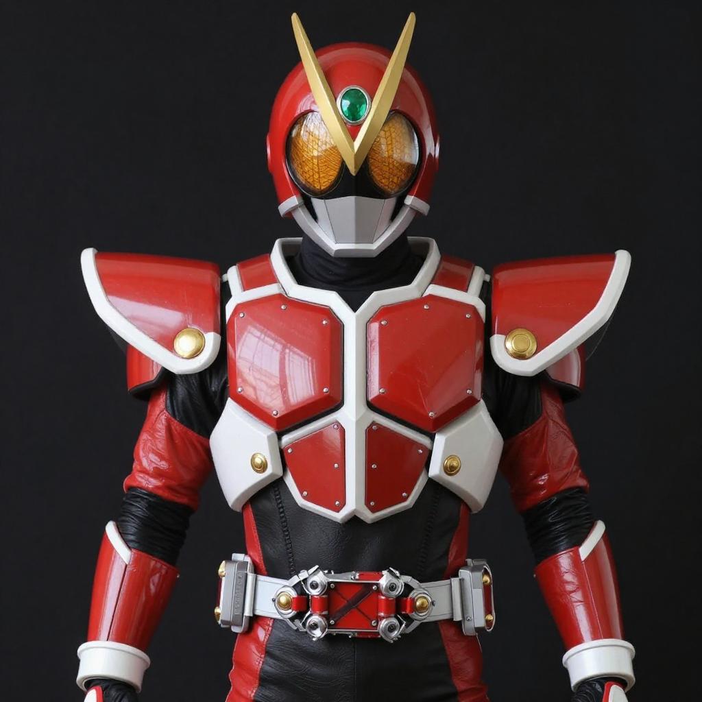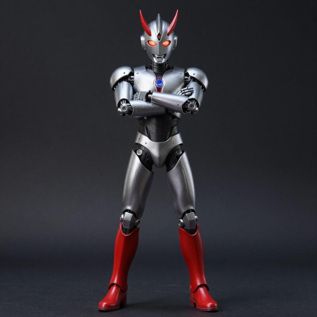 A futuristic humanoid robot with a sleek metallic silver armor design, glowing red eyes, and red horn-like attachments on its helmet. The robot is standing confidently with arms crossed, wearing vibrant red boots against a dark background.