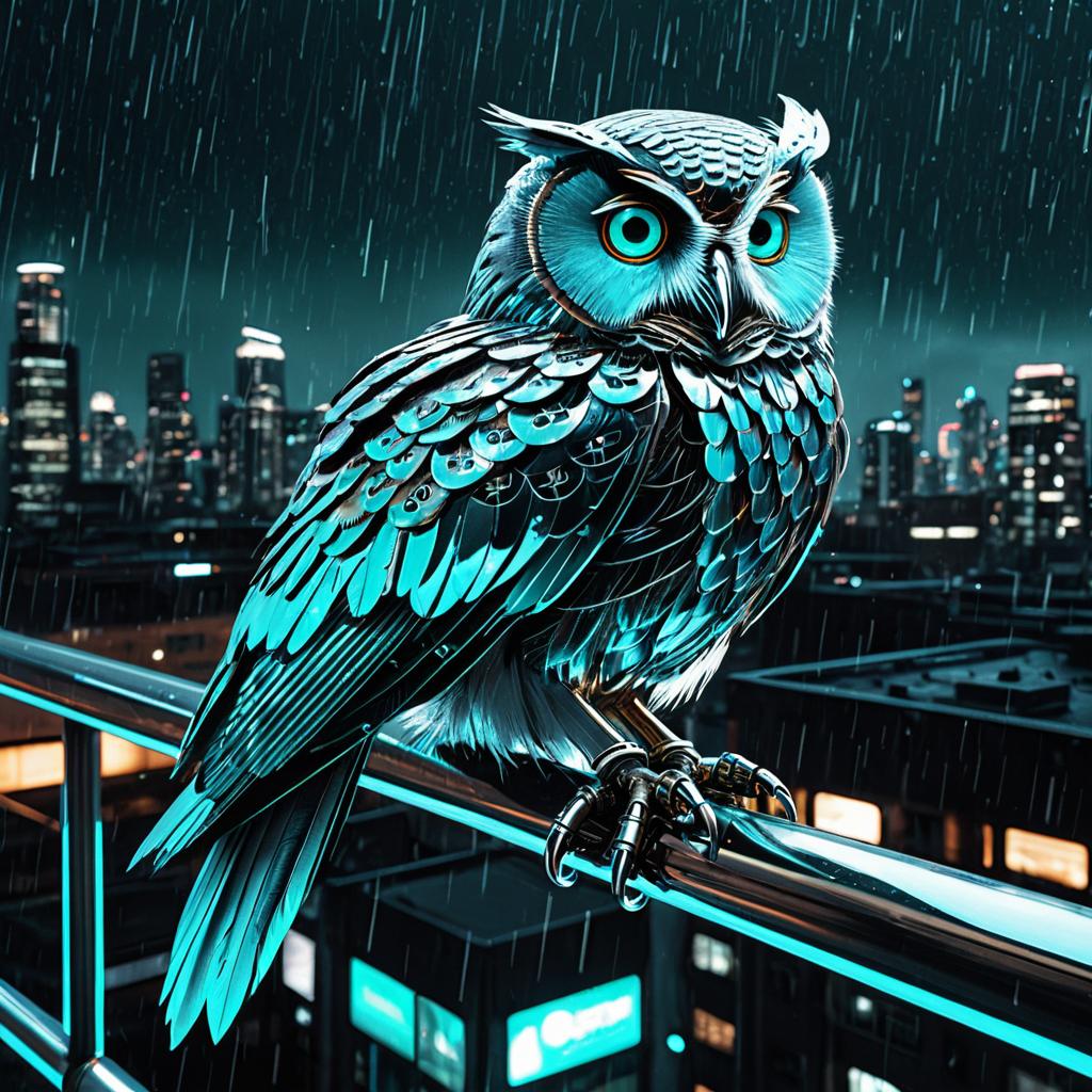 Photorealistic digital art of a high-tech artificial biomechanical owl perched on a chrome railing. The owl features smooth, overlapping metallic feathers with turquoise LED accents and a holographic interface visible in its eye. Set against a dark, rain-soaked urban rooftop backdrop with ambient city lights and tall buildings in the background, creating a futuristic nocturnal atmosphere.
