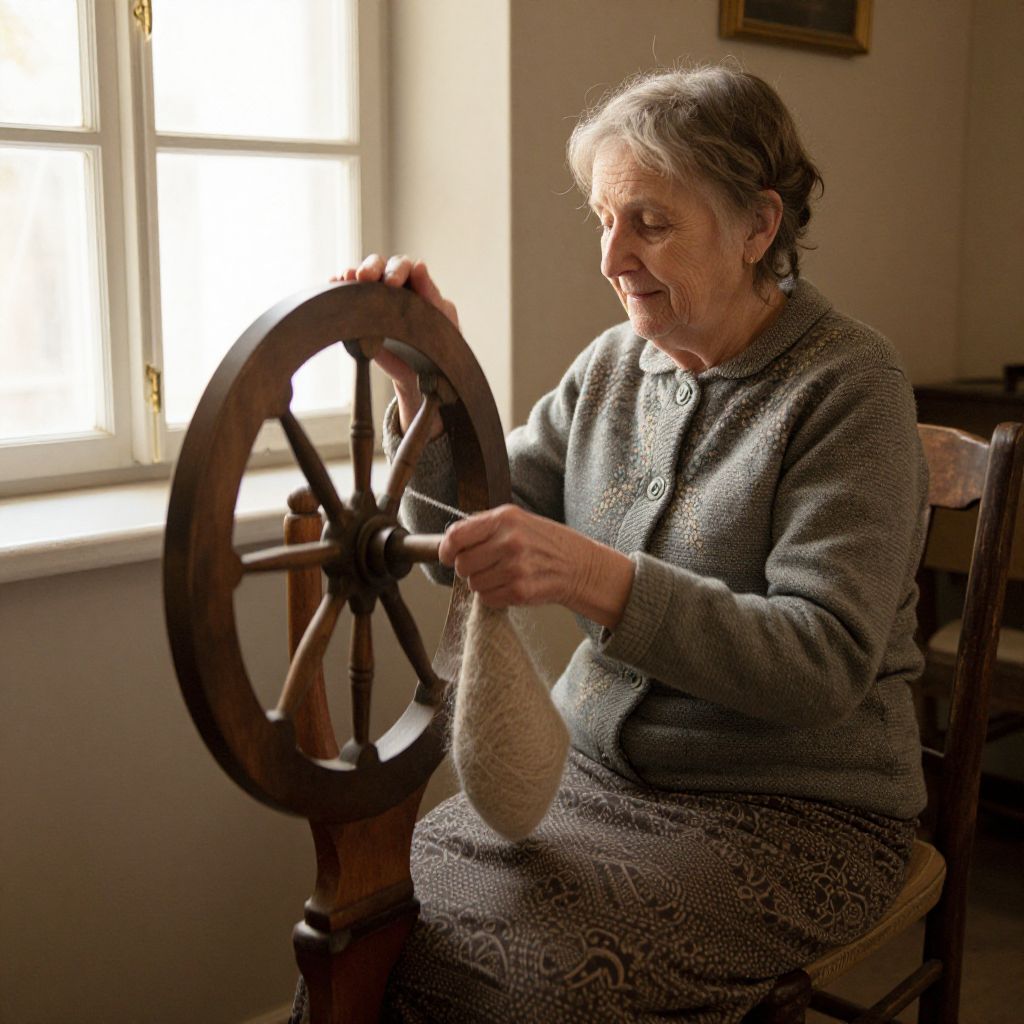 Photograph of an elderly white woman with short, gray hair, wearing a gray, patterned knit sweater and matching skirt, sitting in a softly lit room. She is focused on spinning wool with an antique wooden spinning wheel, holding the fibers in her right hand. Her expression is calm and concentrated. Sunlight streams through a window in the background, casting a warm glow on her face. The room has beige walls and a simple, wooden chair. The image captures the texture of her knit sweater and the wooden spinning wheel.