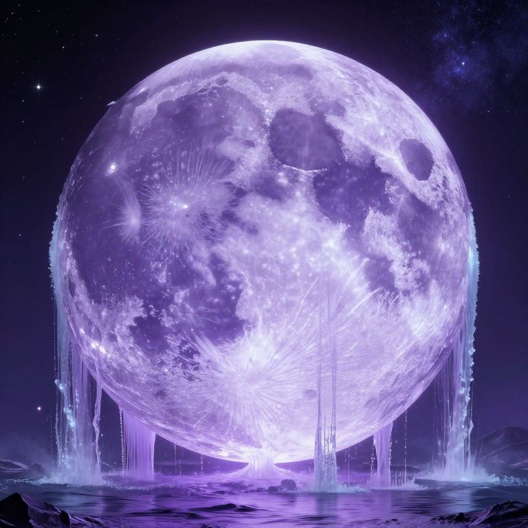 A surreal 3D-rendered scene depicts a colossal, icy moon bathed in violet light, adorned with cascading frozen waterfalls that ripple slowly, evoking the echoes of ancient storms against a starry, cosmic backdrop.