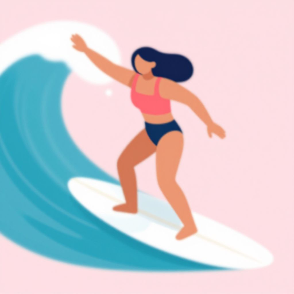This is a digital illustration depicting a woman surfing on a large, curling blue wave. The woman, with short black hair, wears a pink sleeveless top and dark blue bikini bottoms. She is bent slightly forward, with arms outstretched for balance, standing on a white surfboard. The wave is dynamic, showing shades of blue and white, curving behind her. The background is a plain, light pink, emphasizing the action and movement of the surfing scene. The illustration style is simple and colorful, with bold, flat shapes and minimal detail.