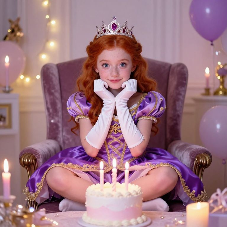 A radiant red-haired girl with wide, twinkling blue eyes and a slightly mischievous smile dressed in a princess birthday outfit — a dazzling, embroidered princess dress in deep purple with gold lace trim, a sparkling crown, and white gloves — sitting cross-legged on a velvet chair in a decorated bedroom with fairy lights, birthday candles, and a glowing birthday cake in the center, surrounded by a magical, dreamy fairy atmosphere.