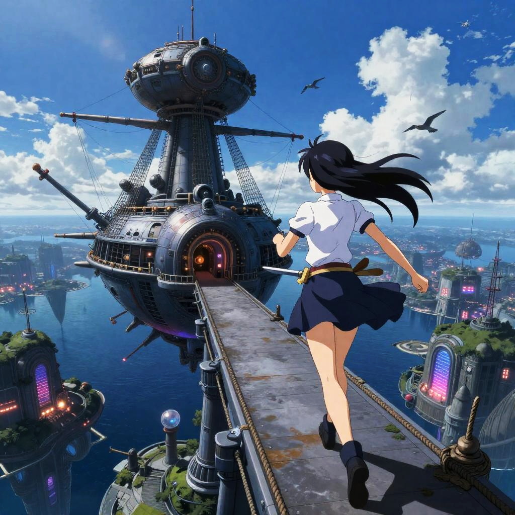 Skybound Miniskirt Swordswoman, Tetsuya Nomura, Surreal, mysterious, bizarre, fantastical, fantasy, sci-fi, Japanese anime, airship moored to an aerial wharf overlooking a neon archipelago at dusk, miniskirt beautiful swordsman running towards the airship on the tethered rope, perfect voluminous body, blue sky, clouds, detailed masterpiece bird’s eye views