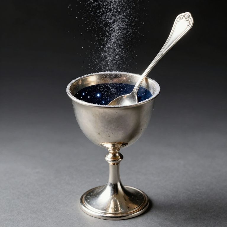 A silver-plated spoon stirs a tempest inside a celestial chalice, its rim emitting stars that fall like sugar into the void.