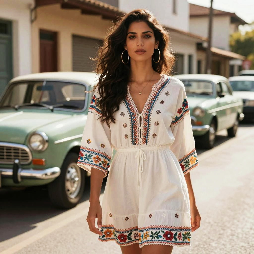 This striking image features a woman elegantly dressed in a bohemian-style dress, standing confidently in a sunlit urban street. The warm tones of her outfit contrast beautifully with the vintage cars lining the street, creating a nostalgic yet modern vibe.