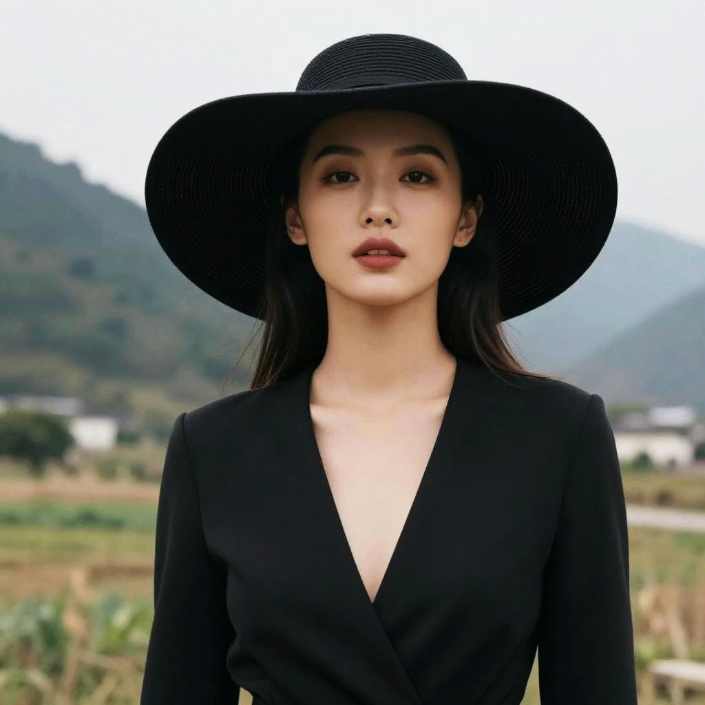 Portrait of an Asian woman wearing a wide-brimmed black hat and a deep V-neck black outfit, standing outdoors with blurred mountains and fields in the background. The image highlights her confident expression and sophisticated style against a natural landscape.