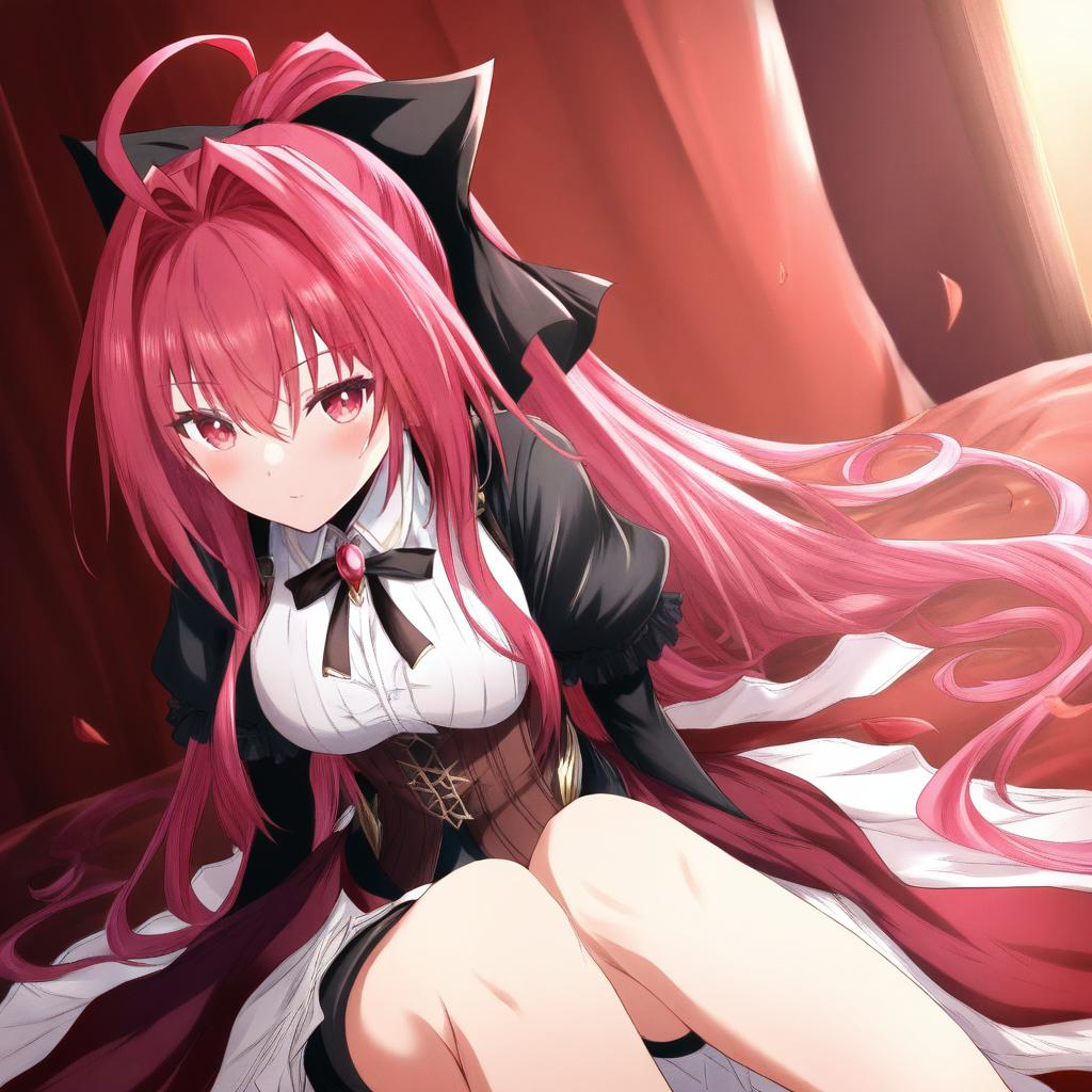 Digital anime-style illustration of a female character with long, flowing red hair styled in a high ponytail with an ahoge strand, adorned with a large black bow. She has red eyes and is dressed in a black and white outfit featuring a bow tie with a pink jewel, a brown corset, and a frilly skirt. The background includes soft, warm lighting with falling rose petals, enhancing the dramatic and elegant atmosphere.