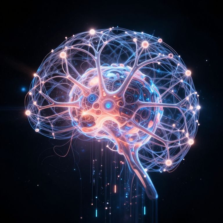 Digital CGI image of a glowing, neon-lit brain with intricate white and blue neural connections against a black background.