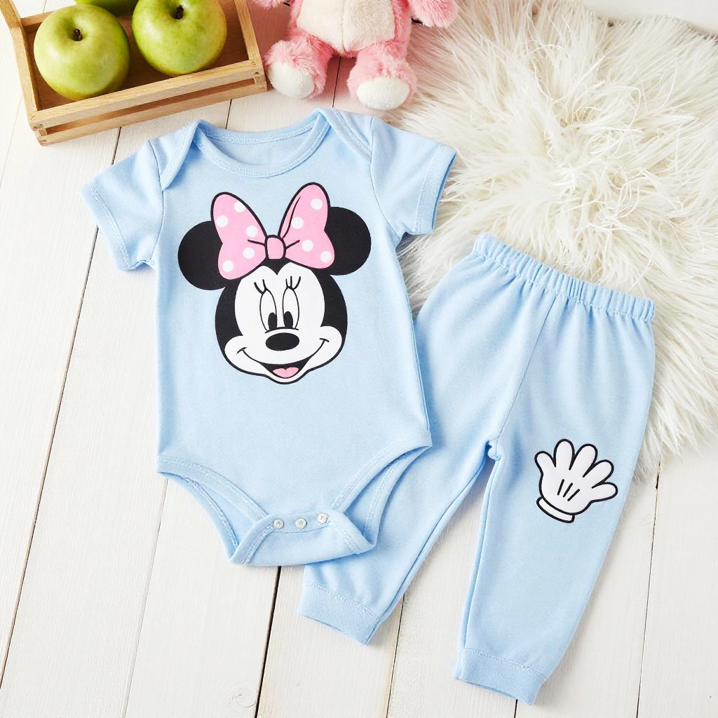 A photograph of a light blue baby onesie and matching pants set. The top features a large, cute Minnie Mouse face with a pink polka-dot bow, while the pants have a small white-gloved hand graphic. The set is laid out on a white wooden floor with a fluffy white rug partially visible. In the background, a wooden shelf holds green apples and pink stuffed animals.