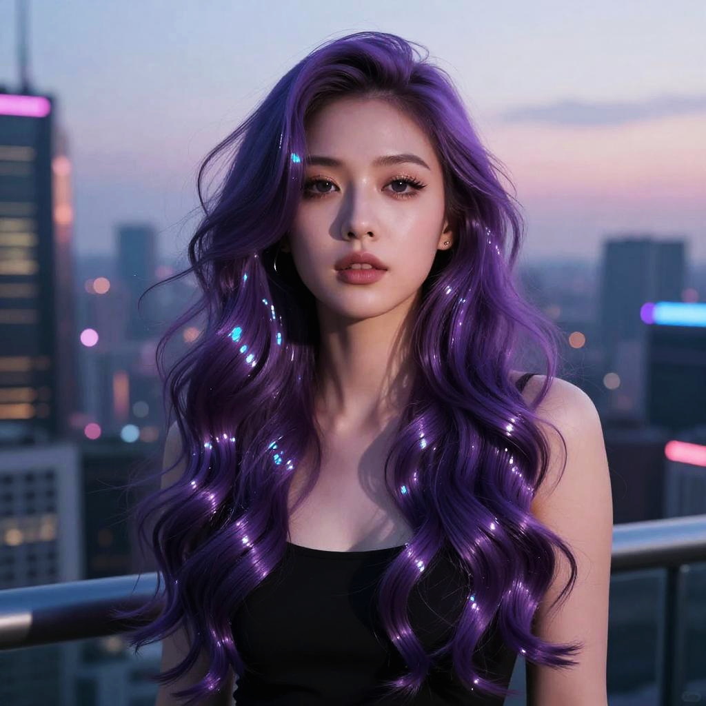 A portrait of a woman with vibrant purple wavy hair flowing freely, set against a futuristic cityscape at dusk, neon lights reflecting off her hair, cyberpunk aesthetic