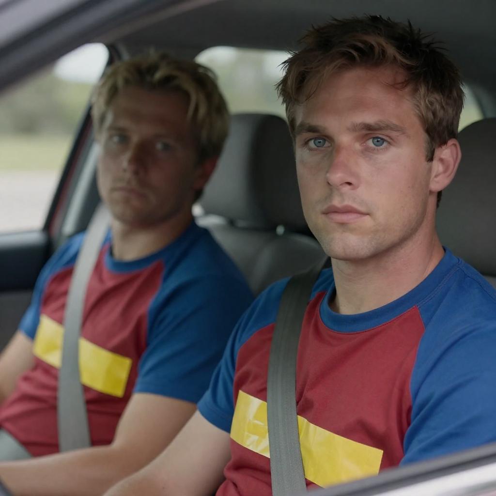 Photograph of two men in a car, both wearing striped red and blue shirts with yellow tape across the chest. The man in the foreground has intense blue eyes and light brown hair, looking forward. The man in the background has blonde hair, slightly tousled, and a serious expression. Both men have light skin. The car's interior is visible.