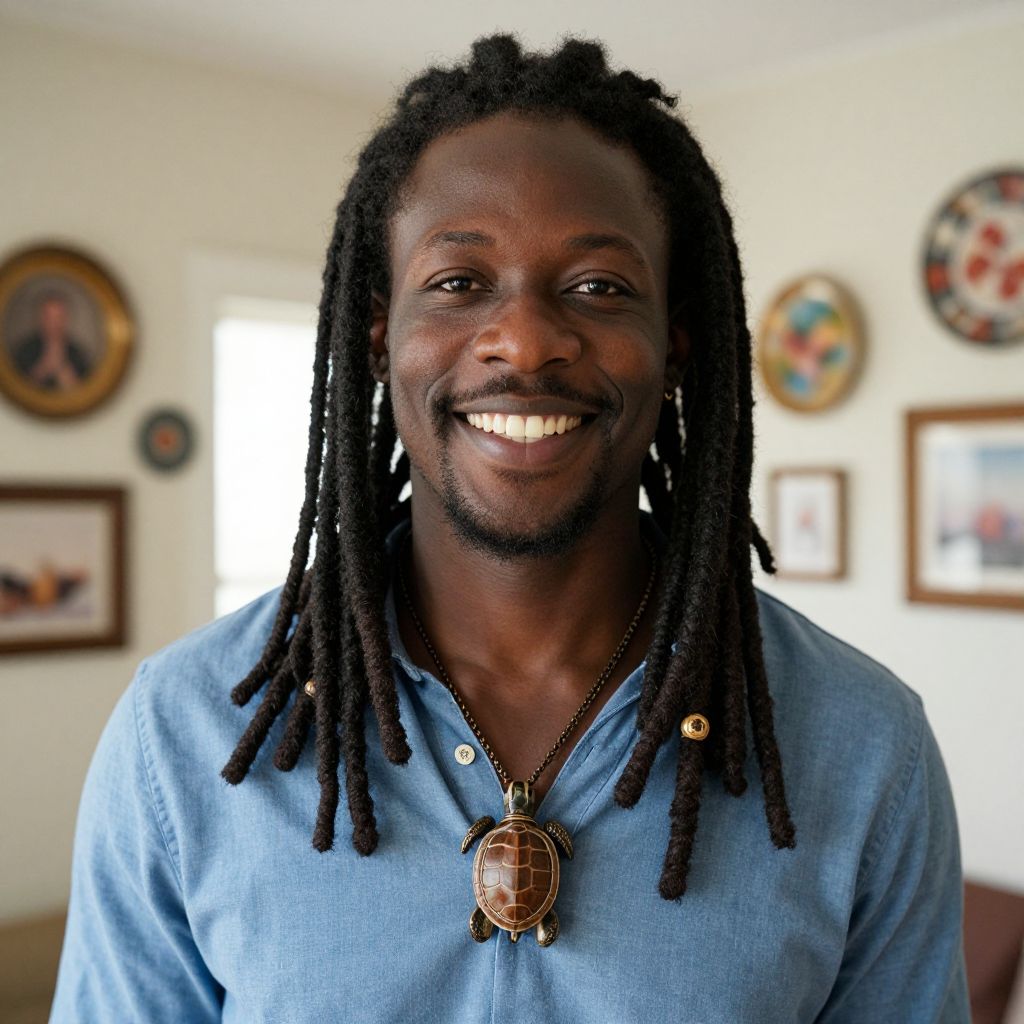 Photograph of smiling African American man with dreadlocks, wearing a blue button-up shirt, turtle pendant, in a home with framed art.