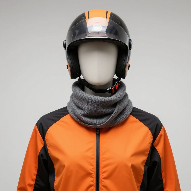 Mannequin wearing a helmet, orange and black outfit with a gray scarf around his neck.