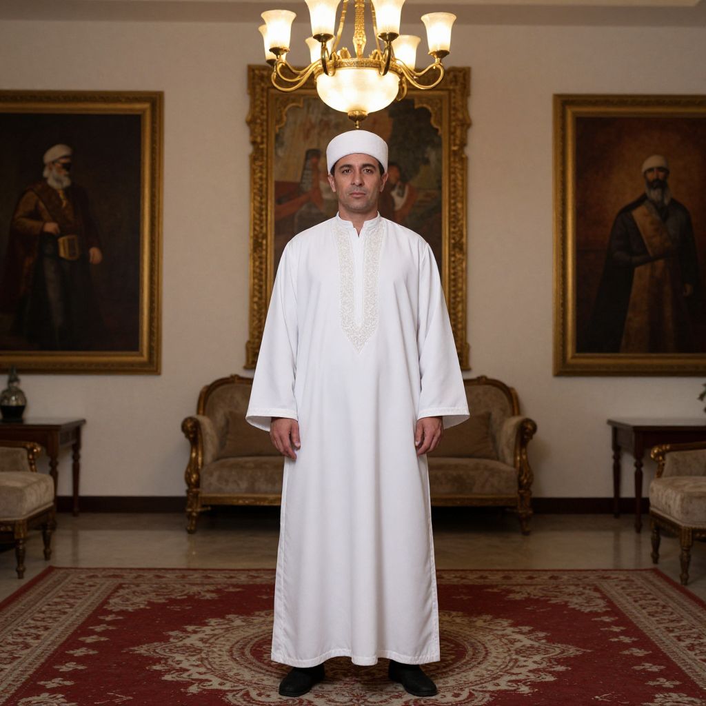 Photograph of a man in white traditional attire and cap, standing in an elegant room with chandelier, framed portraits, and ornate furniture.