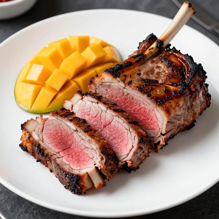 Sliced prime rib roast with a perfectly seared exterior and medium-rare interior rests on a white plate alongside diced mango, showcasing a harmonious blend of savory and sweet flavors.