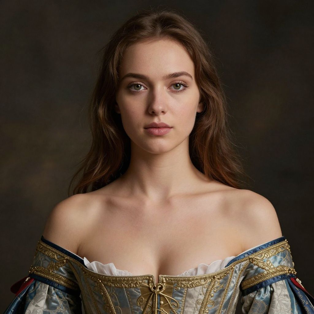 Face portrait of young beautiful attractive luscious german latvian russian glamour female wearing low cut 17 th century off - the - shoulder neckline bodice, jodhpurs greg manchess painting by