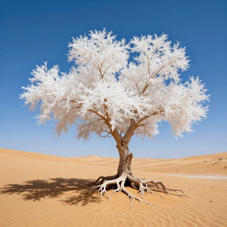 Singular crystalline tree stands alone in a vast desert landscape, its radiant white foliage glowing against the azure sky, casting intricate shadows as its exposed roots weave into the golden sand below.