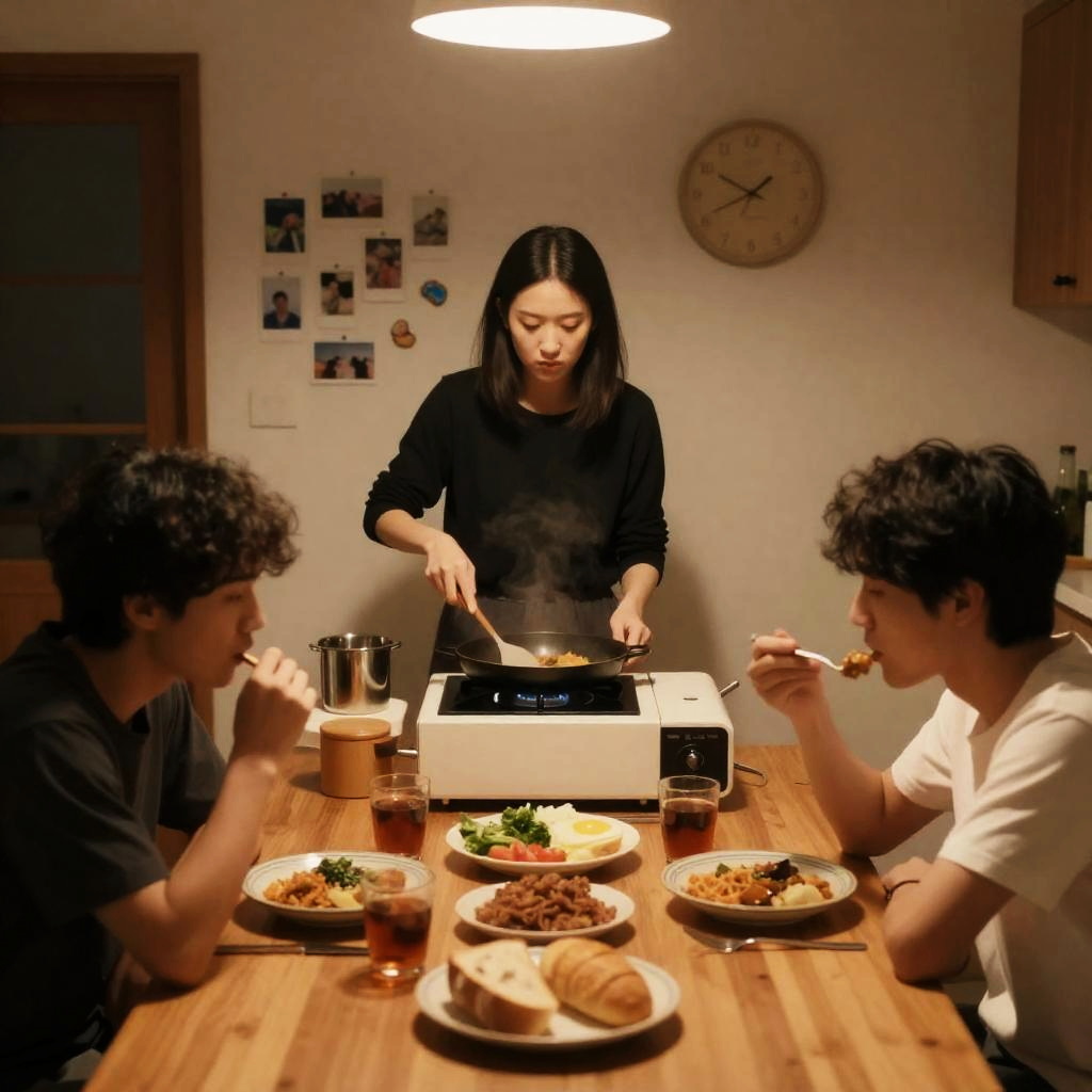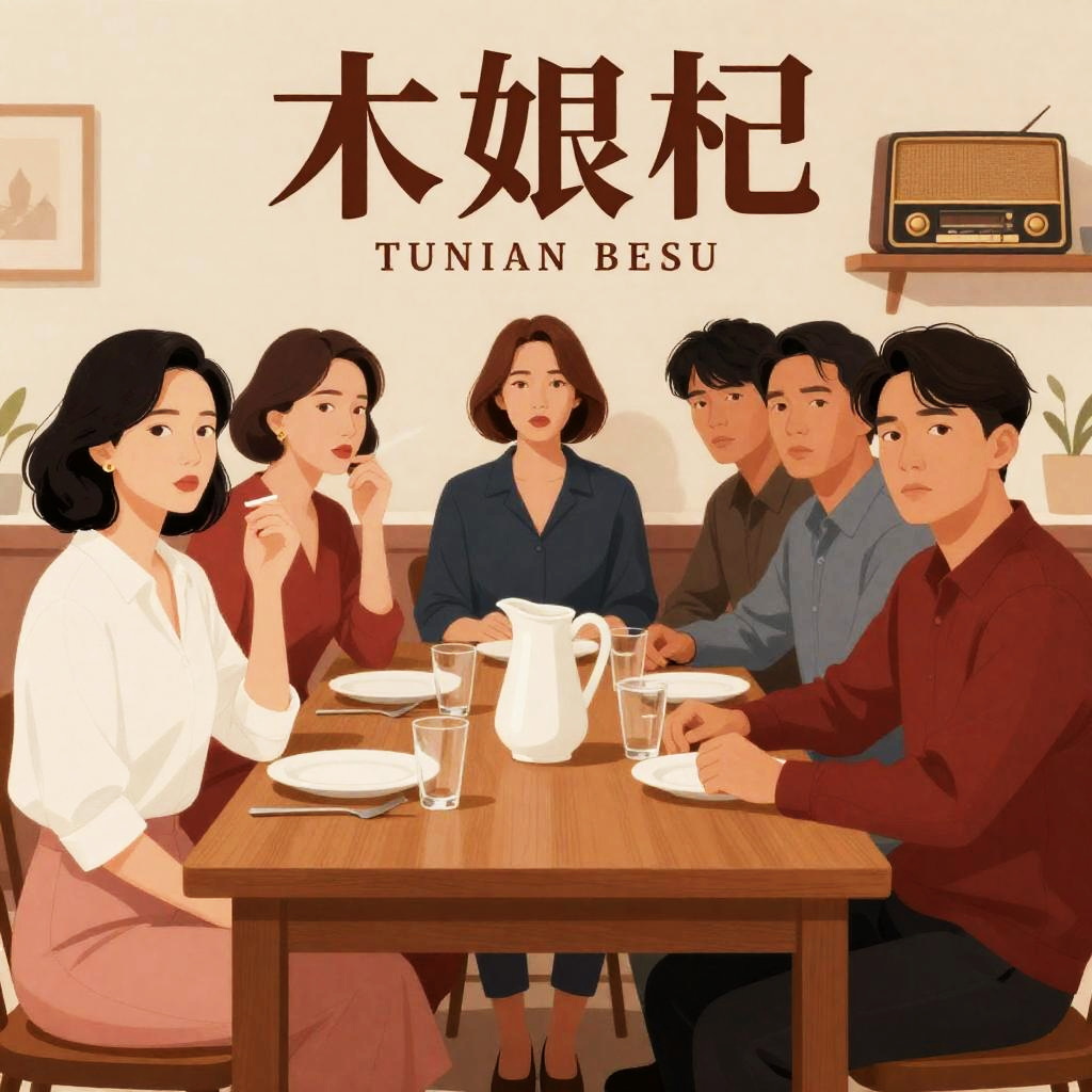 Movie poster illustration of "Seven Women" with five people seated around a wooden table. Two women on the left, one smoking, wearing white and pink. Three men on the right, wearing red and blue. Table with plates, glasses, and a pitcher. Background includes a vintage radio and shelves. Formal, serious facial expressions.