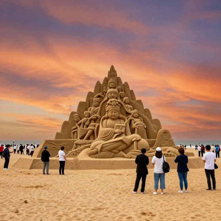 Depiction of ceating a giant sand sculpture on a vast beach at sunset, crowds admiring the detailed artwork, golden sands, dramatic sky with orange and purple tones, realistic textures, artistic celebration atmosphere