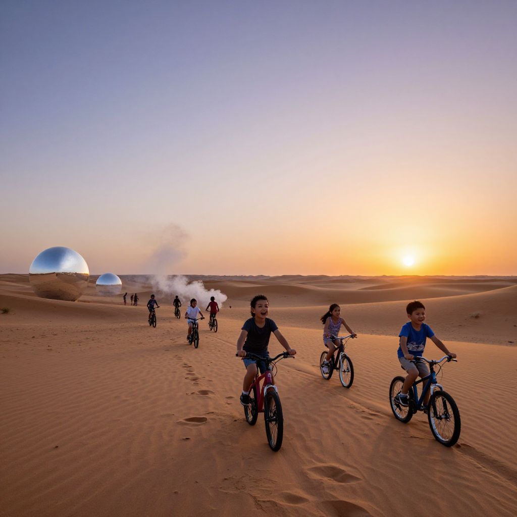 Photograph of children biking in a desert at sunset, with glowing domes in the background and a colorful sky.