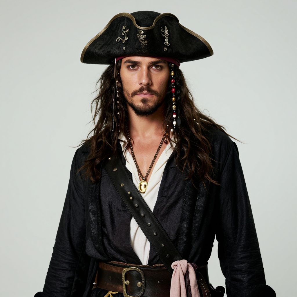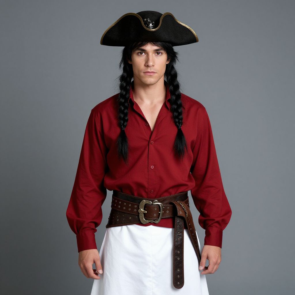 Photograph of a young man with pale skin and dark, long braided hair, dressed as a pirate. He wears a black tricorn hat with a silver emblem, a deep red, long-sleeved, button-up shirt, and a white, knee-length skirt. A brown leather belt with a large silver buckle cinches his waist, and a matching belt with a strap hangs down the side. The background is a solid, light gray, making the subject stand out. His expression is neutral, and he stands facing the camera directly.