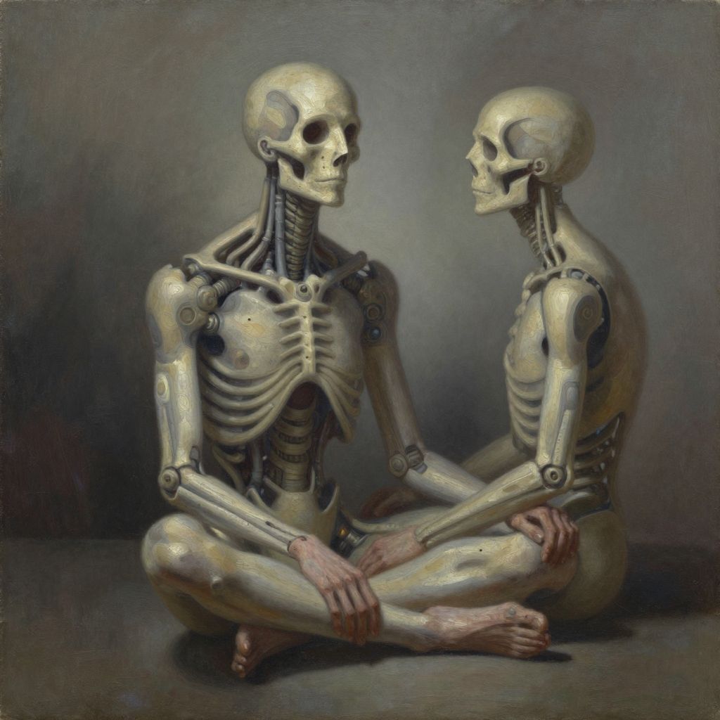 Photorealistic digital painting of two skeletal figures sitting cross-legged, facing each other, with hands gently touching, against a dark, gradient background.