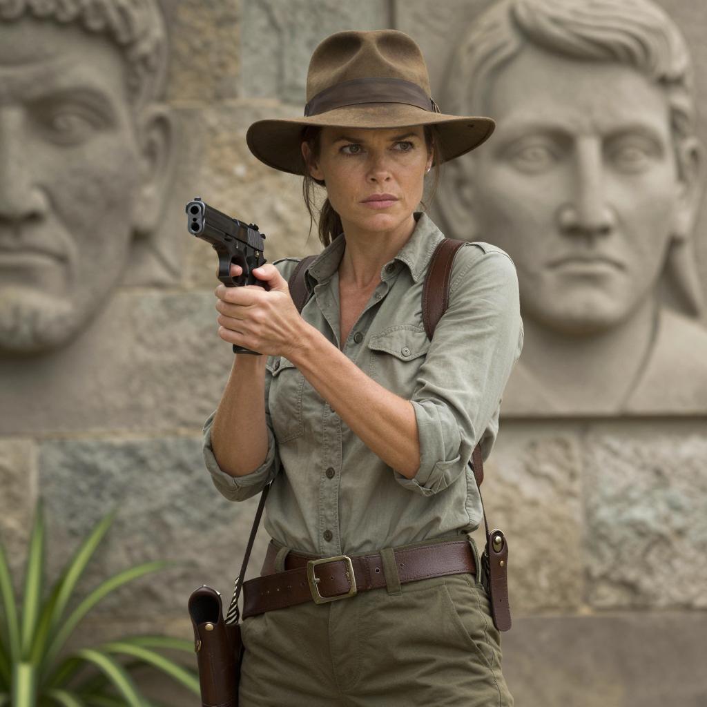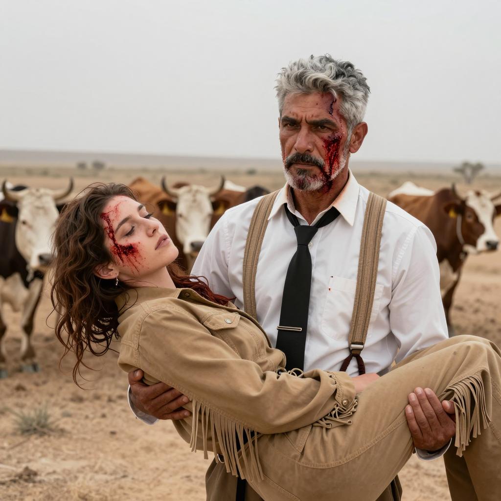 Middle-aged woman with curly brown hair, wearing off-shoulder white dress with lace and pearl necklace, being pushed by muscular man with brown hair, wearing brown shirt and pants. Both look alarmed. Background has large fire, ornate lanterns, and clay pots. Woman's dress has intricate lace and ruffles, man's shirt has leather straps. Fire in background emits bright yellow and orange flames. Man's right hand grips woman's waist. Both are in motion, moving towards the left. Number of people: 2. Facial expressions: alarmed.