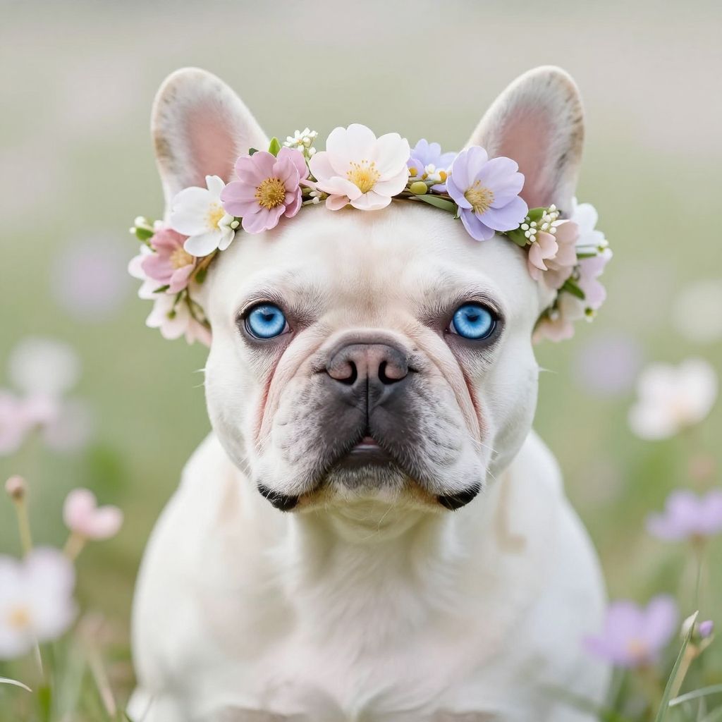 White Frenchie blue eyes with a floral crown, surrounded by spring wildflowers, soft pastel colors, ethereal and dreamy mood, high detail and sharp focus on eyes and fur