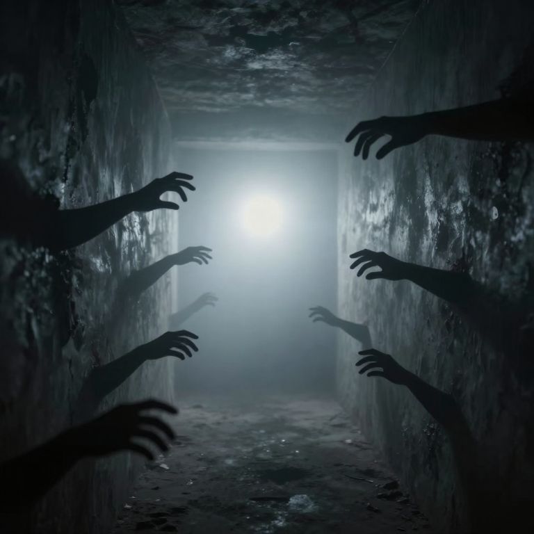 Photograph-like digital artwork depicting a dark, narrow, wet corridor with a bright white light at the end. Silhouetted against the light are six ghostly, outstretched hands emerging from the walls on both sides, fingers splayed. The walls are textured with a grimy, wet appearance, and the floor is reflective, adding to the eerie atmosphere. The hands are black and shadowy, contrasting sharply with the bright light, creating a sense of foreboding and suspense. The overall color palette is dark blues and grays, enhancing the haunting effect.