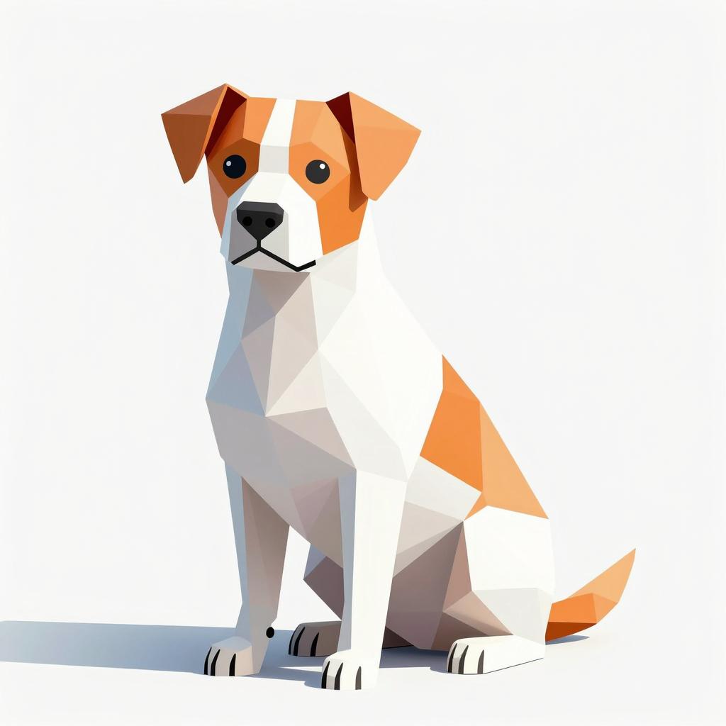A low poly geometric style polygonal abstraction of a dog sitting on a plain background, modern art style with clean lines and sharp edges, strong color contrasts in orange, white, and blue color scheme, digital art rendering