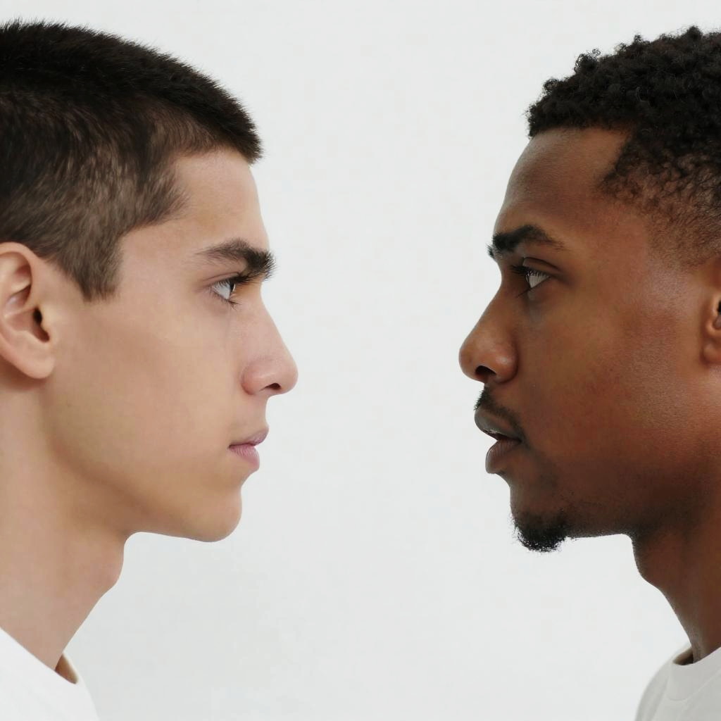 Close-up photograph of two men with intense facial expressions, facing each other. Left man has light brown skin, short dark hair, white shirt, focused gaze. Right man has darker skin, short black hair, slightly open mouth, looking up. White background.