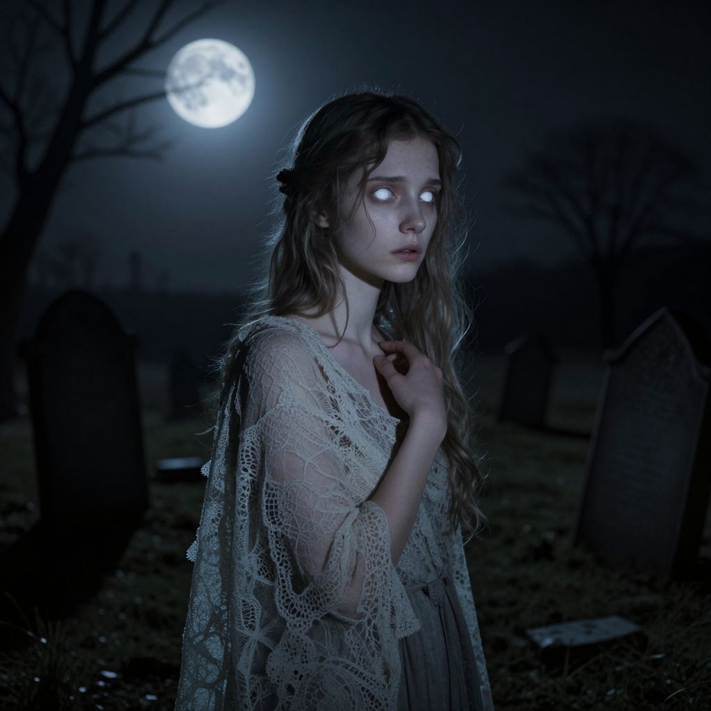 Photograph of a pale, long-haired woman with glowing white eyes, wearing a lace shawl, standing in a dark, moonlit cemetery with tomb