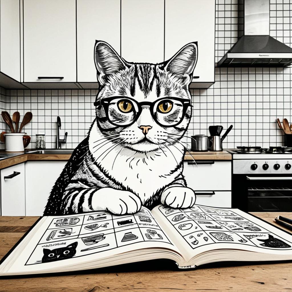 Artwork of a black and white illustrated cat wearing reading glasses, sitting behind an open book on a wooden table. The background features a minimalist kitchen with white cabinets, black countertop, stainless steel sink, stove, and patterned white backsplash tiles. The style is inspired by Gemma Correll, with quirky, humorous line art details.