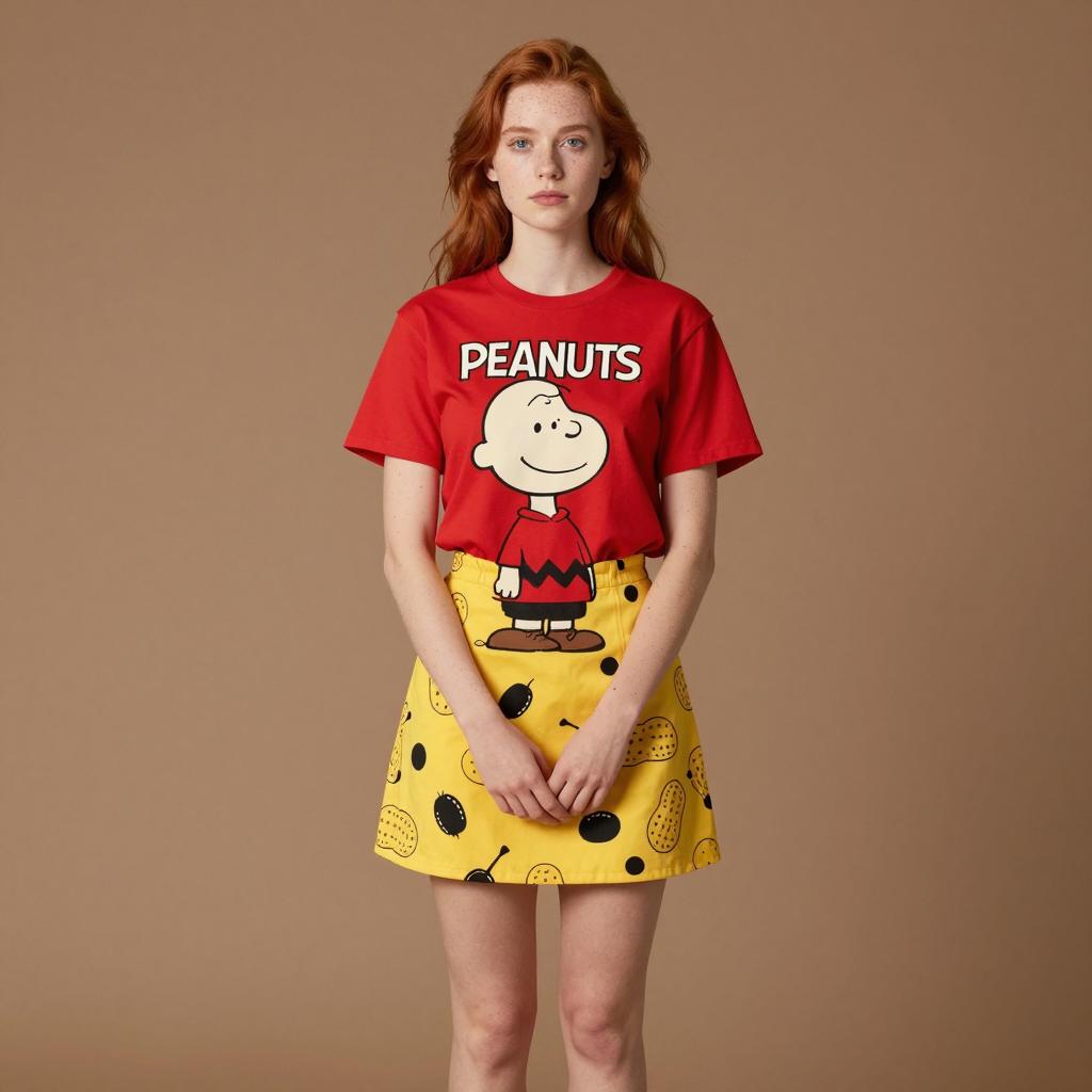 Full body portrait of a young woman with fair skin and red hair wearing a red t-shirt featuring the Peanuts character Charlie Brown and a yellow mini skirt patterned with black and peanut designs. She stands against a plain brown background with a neutral expression and hands clasped in front. The image has studio lighting with flat colors and minimal shadows, showcasing a casual style.