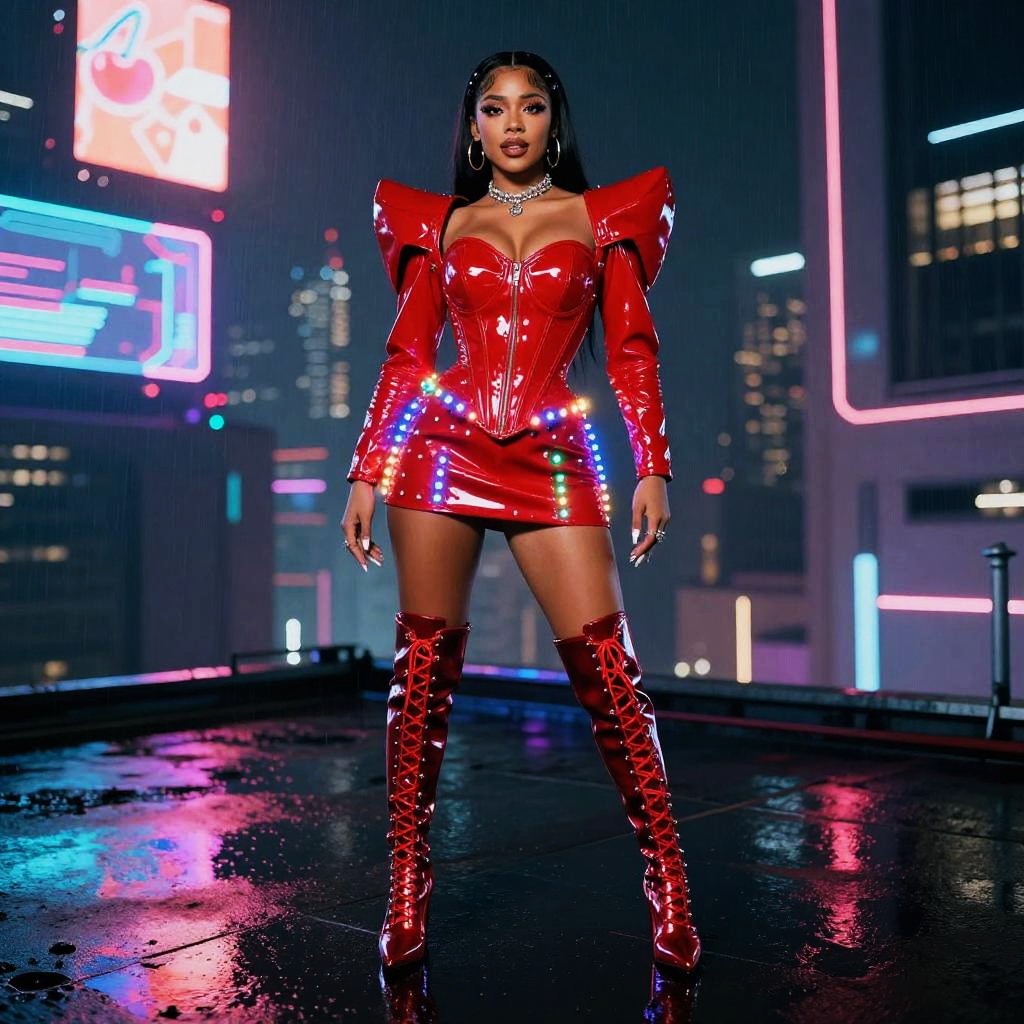 Doja Cat red outfit, worn by retro-futuristic pop icon, featuring high-shine crimson vinyl corset with sculpted shoulder pads, micro-mini skirt studded with LED embellishments, and thigh-high gladiator boots, in neon cherry with chrome red accents, set against cyberpunk rooftop at night with holographic billboards and rain-slick reflections.