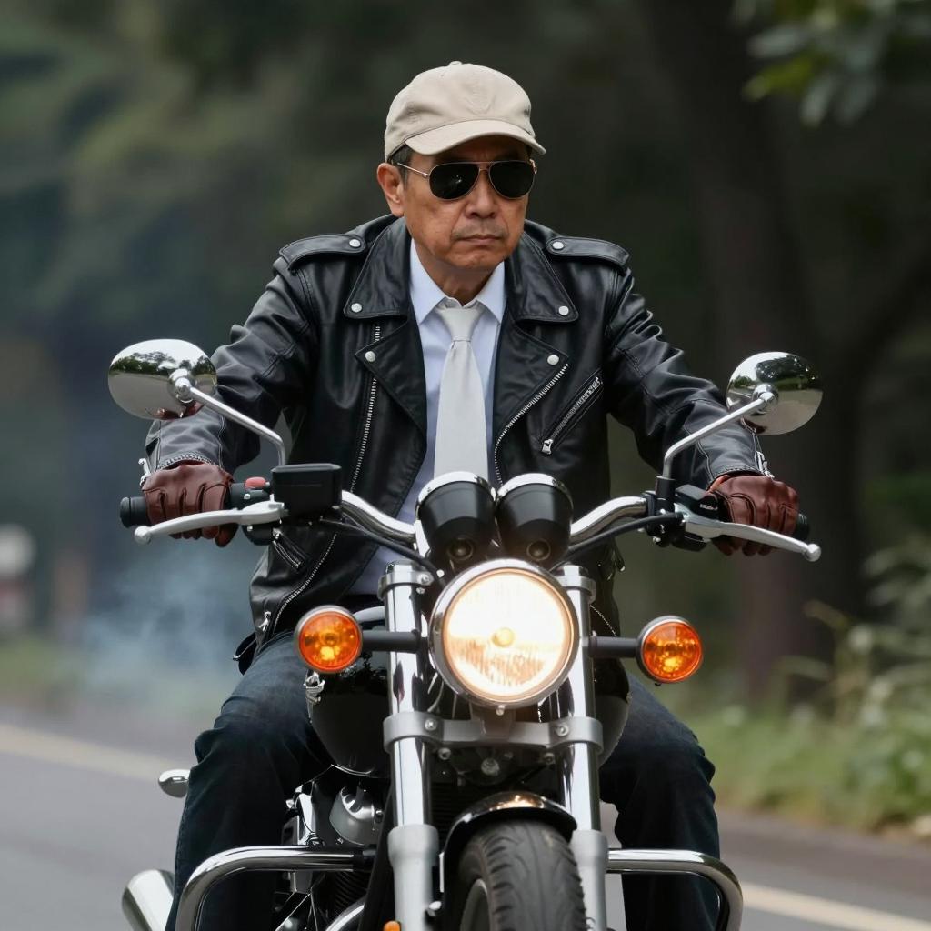 Middle-aged man riding a motorcycle. Wearing a beige cap, dark sunglasses, black leather jacket, white tie, brown gloves. Red and white lights on motorcycle. Dark green trees in background. Smoky exhaust visible. Man's face is serious, focused. Motorcycle is centered in the frame. Background is slightly out of focus.