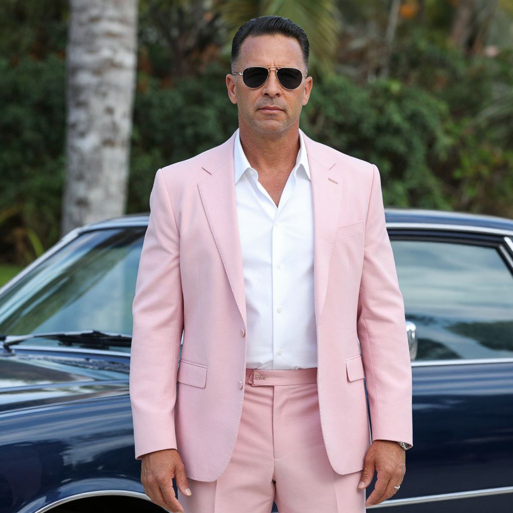 Miami Vice Outfit, man in a pink suit and sunglasses standing in front of a car