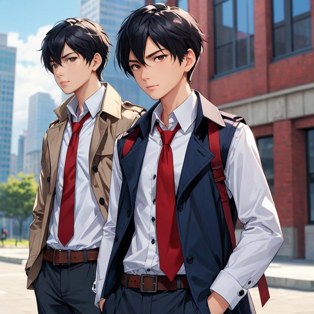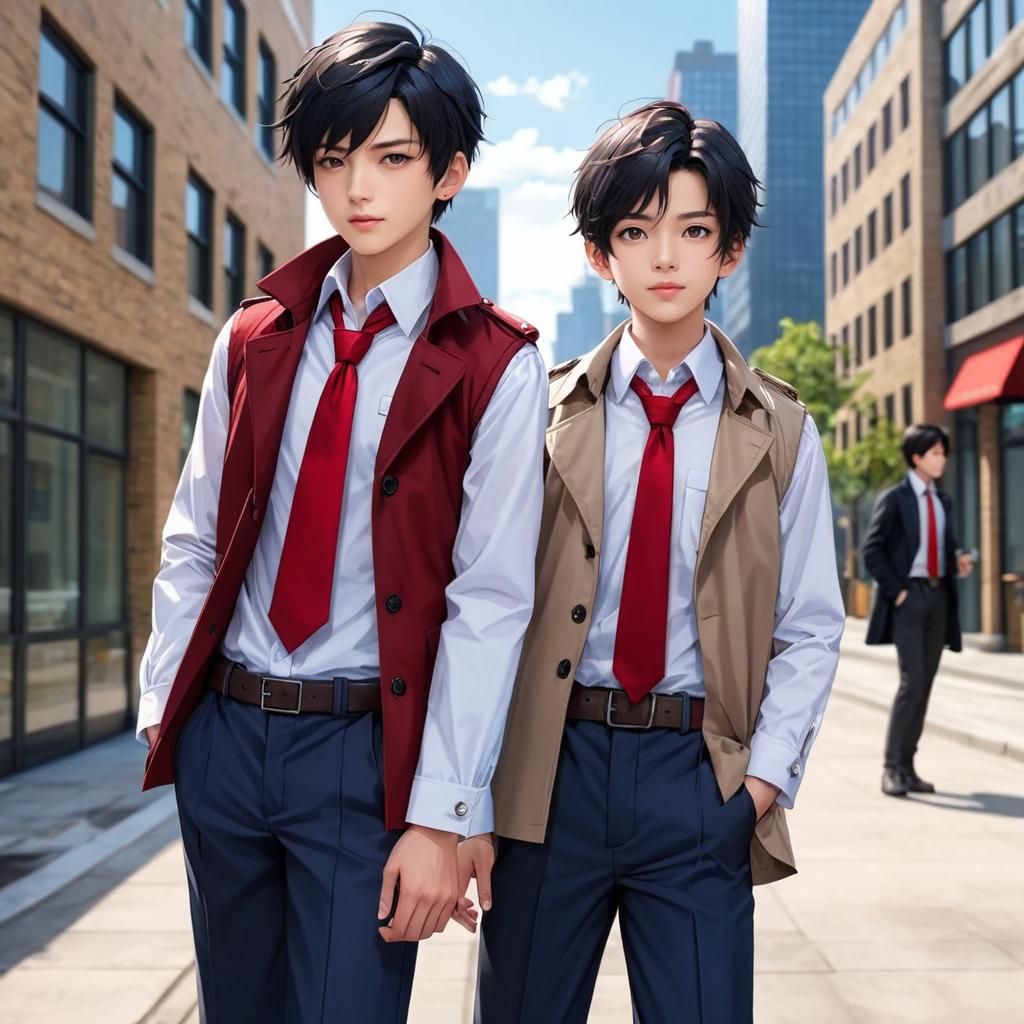 Black hair, necktie, male focus, multiple boys, hands in pockets, building, coat, outdoors, 2boys, short hair, pants, vest, white shirt, shirt, red necktie, belt, trench coat, city, sky, collared shirt, hand in pocket, jacket, closed mouth, suit, 1boy