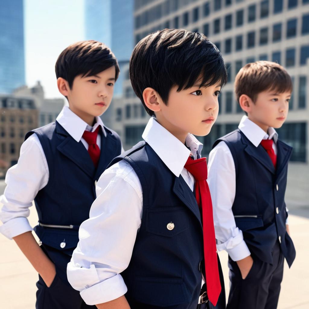 Three young boys dressed in formal shirts, ties, and sleeveless trench coats posing confidently in an urban environment with modern skyscrapers in the background. The boys wear coordinated outfits featuring white shirts, various colored ties, and vests in beige, black, and red, standing on a city sidewalk.