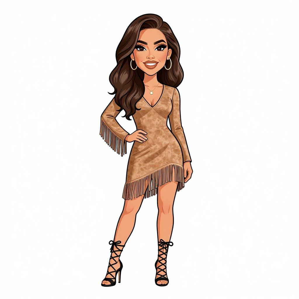 Woman with pretty face and pretty hair. smiling Woman, Western, faux suede mini dress in tan, V-neckline, long sleeves with fringe detailing, asymmetrical fringe hem, strappy high-heeled gladiator sandals in black, minimal jewelry with pendant necklace. --sref 1467