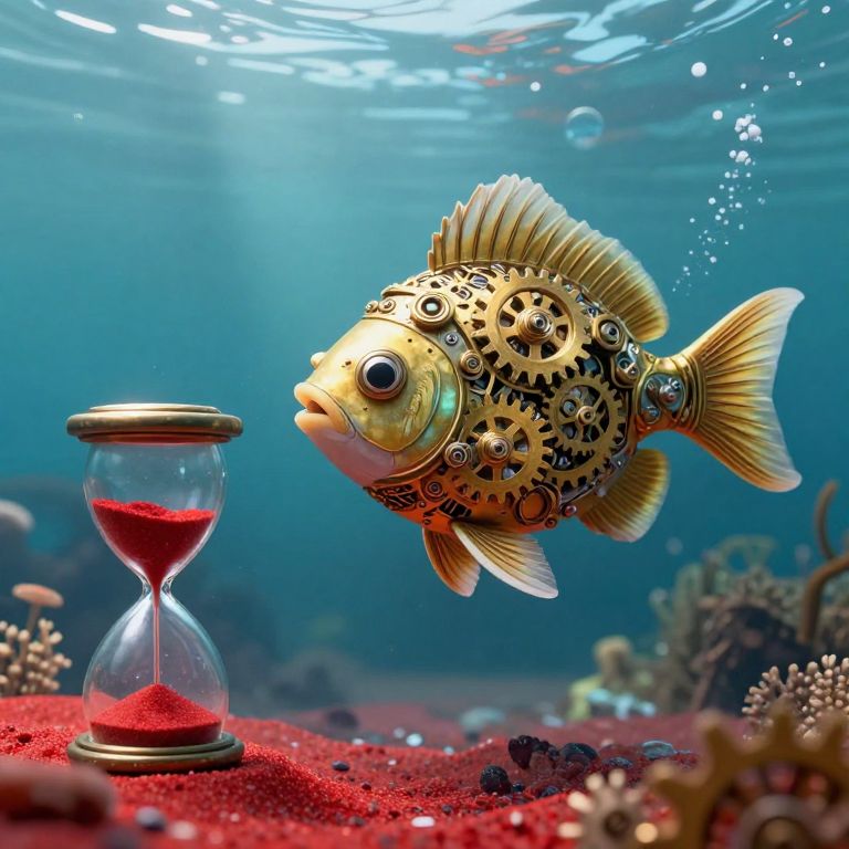 A fantastical 3D-rendered clockwork fish, adorned with intricate golden gears and mechanical details, gracefully swims through a serene underwater world, its gills ticking rhythmically as it hovers near a floating hourglass filled with vibrant red sand, evoking a surreal blend of steampunk and aquatic wonder.