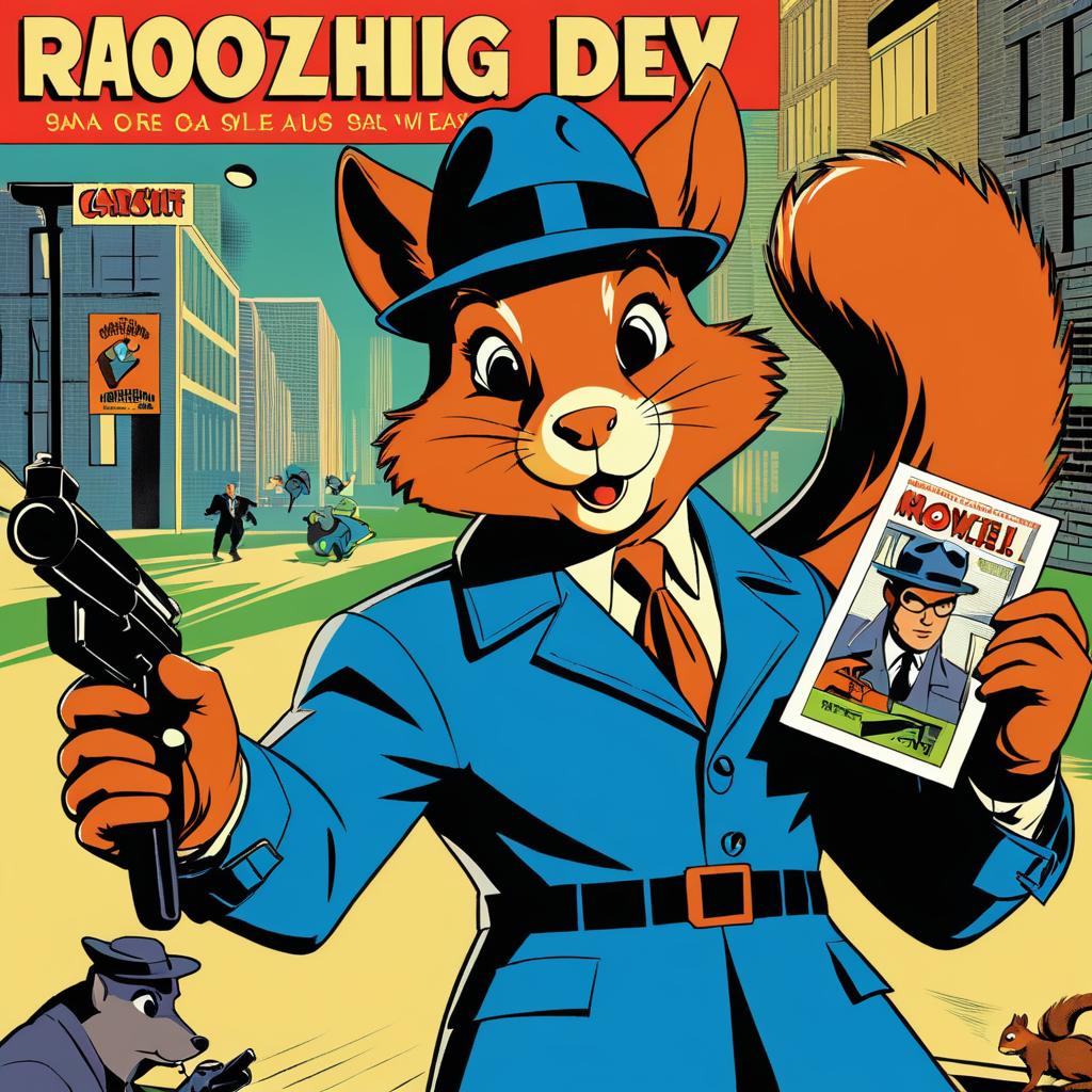 Retro comic book cover of a talking squirrel as a detective, dynamic and adventurous.
