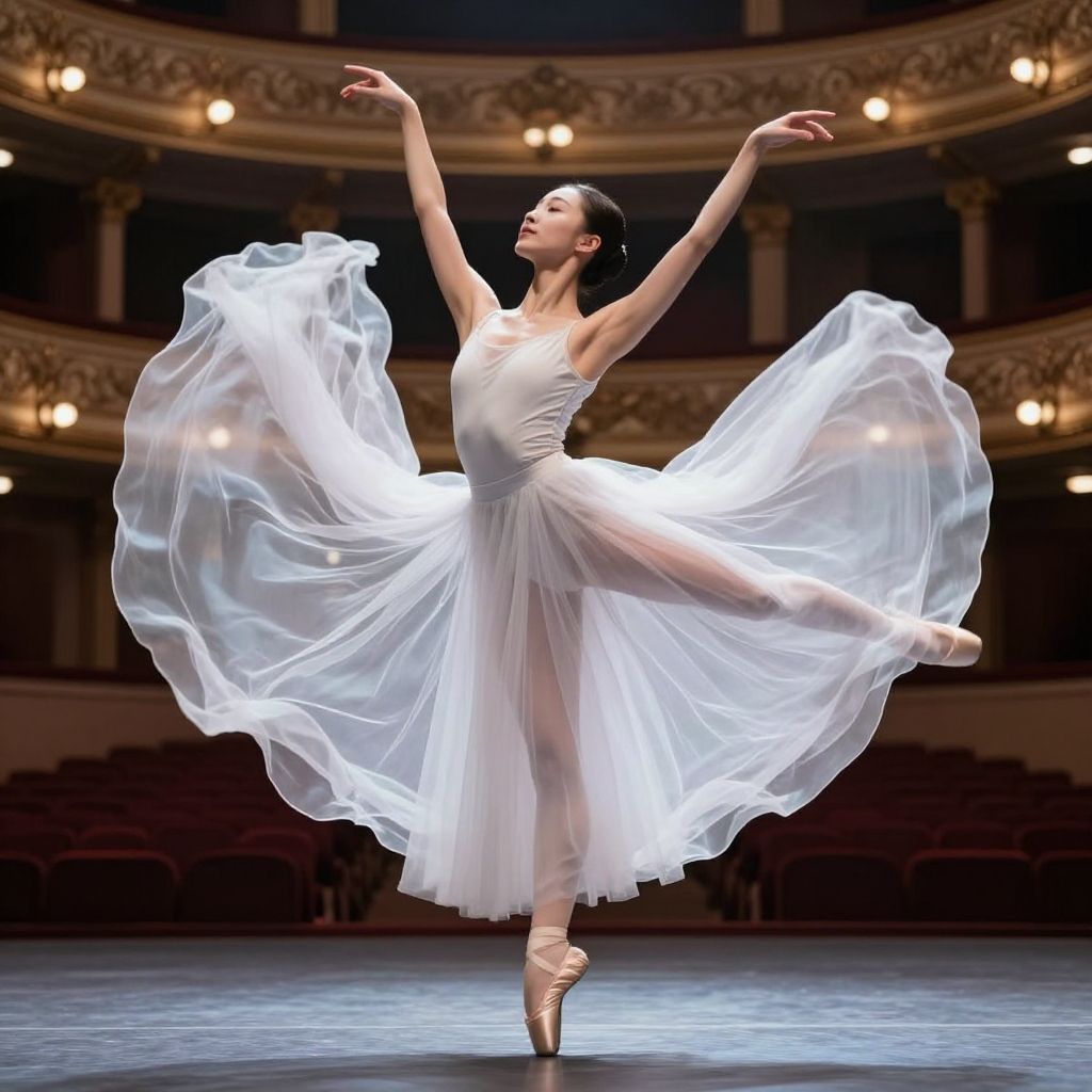 Transparent white dress worn by a graceful ballerina mid-pose, soft lighting highlighting sheer fabric, ethereal atmosphere in a classic theater setting, highly detailed and artistic
