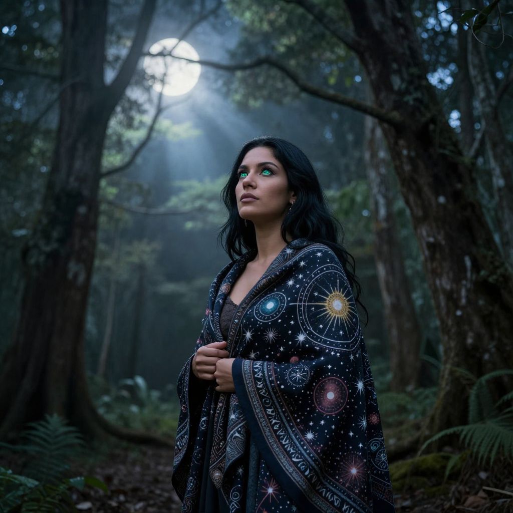In a serene moonlit forest, ethereal beams of light filter through the canopy from above, illuminating a solitary figure - an enigmatic Hispanic woman with piercing emerald eyes and flowing raven hair. She is dressed in an intricate shawl adorned with celestial patterns, standing amidst ancient trees. Her expression is a blend of tranquility and deep contemplation, as if lost in thought or communing with the spirits of the nature surrounding her. The Caribbean woman's connection to the timeless beauty of the forest is palpable; the interplay between the natural world and her ethereal presence creates an emotional gradient that resonates with profound wonder, introspection, and awe.