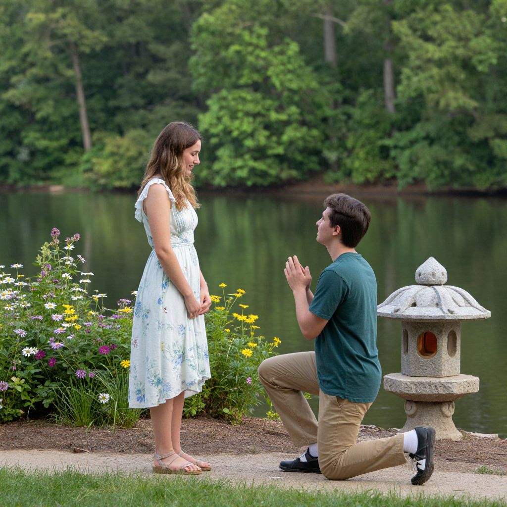 Man kneels on one knee by a serene lake, proposing to a woman in a floral dress, surrounded by lush greenery and a picturesque stone lantern in Nashville, TN.