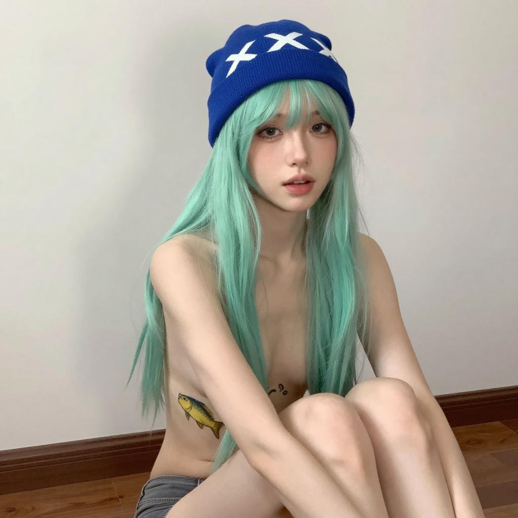 Photograph of a slender, fair-skinned woman with long, mint-green hair and bangs, wearing a blue hat with white symbols. She is nude, with a yellow fish tattoo on her right breast, sitting on a wooden floor in front of a white wall. Her expression is slightly surprised, and she is positioned slightly to the right, with her left arm resting on her knee.